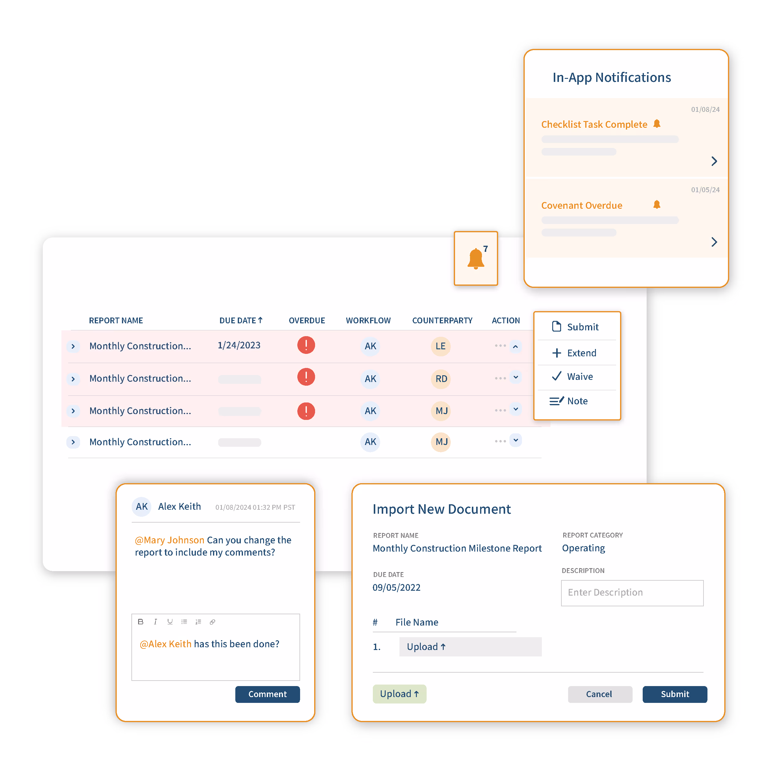 Keep on track of deadlines and covenant performance. Stay on top of key activities like approvals, submissions, and document changes.